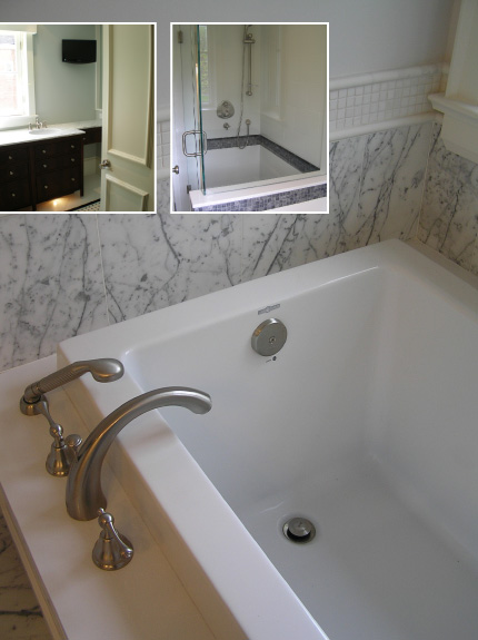 In a bathroom, use inexpensive tiles for the major floor or wall areas. Splurge on stone, glass or decorative tiles for a touch of glamour.